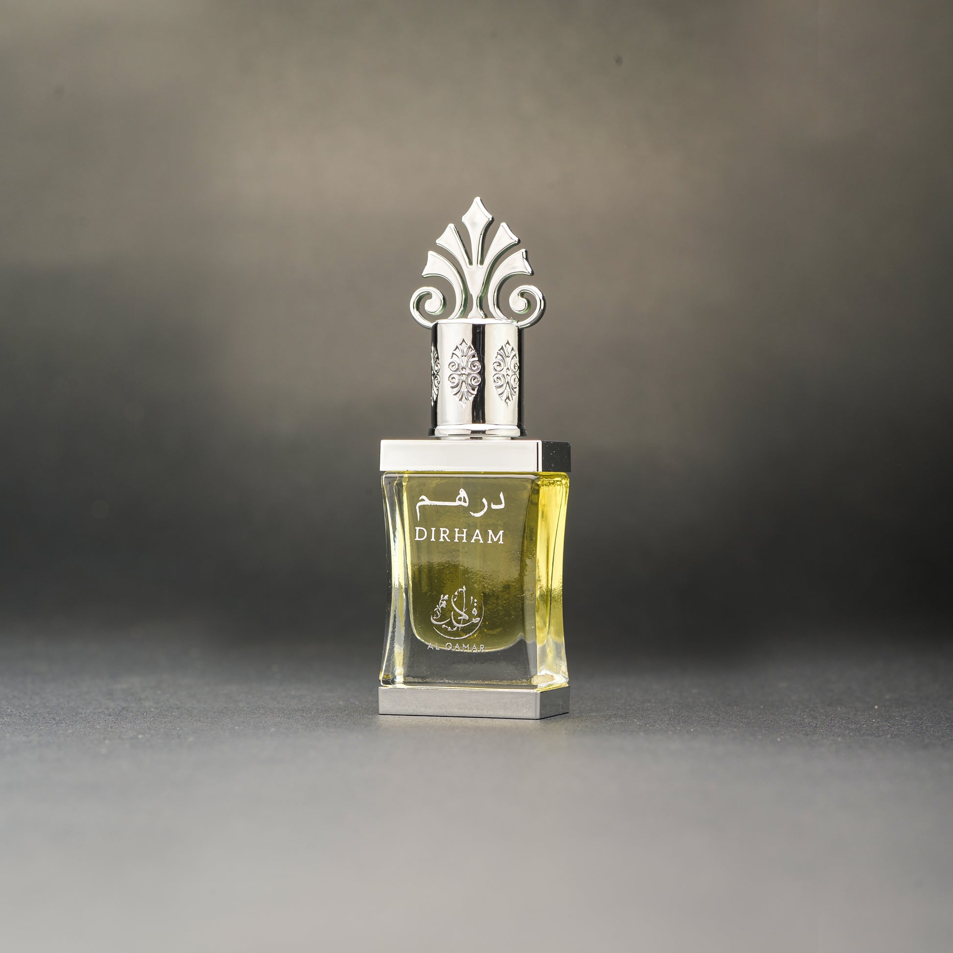 Dirham is an enchanting fragrance that marries vibrant florals with tempting fruits. It opens with a zesty citrus burst followed by a breeze of fresh notes. The heart showcases a captivating blend of freesia, geranium, and jasmine, complemented by the lingering sweetness of ripe fruits. The scent settles into a mesmerizing base of ambergris, moss, and musk, providing a warm and comforting embrace.
